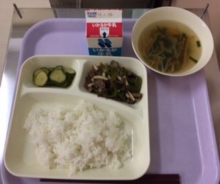 おかずは、チンジャオニューロウスー、きゅうりの辛み付、ハムと野菜の中華スープと中華風です。