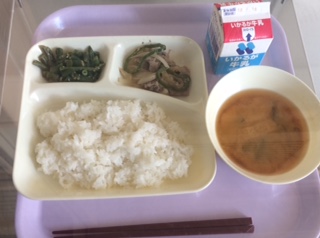 おかずは、鶏肉とピーマンのしょうが焼き、かぼちゃのみそ汁、三度豆のごまあえです。