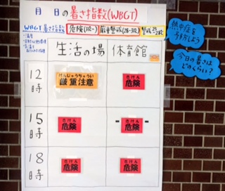 学校でも注意喚起をしていますが、その一環として玄関ホールに「暑さ指数表」が登場しました。