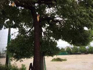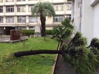 校庭のヒマラヤ杉が倒れたり、クスノキの枝が引きちぎられ運動場に飛ばされていたり・・・