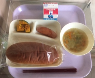 フランクフルトのケチャップソース、鶏肉と野菜のスープ、焼きかぼちゃと黒糖パン(大)、牛乳です。