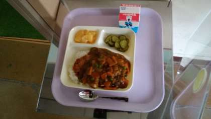 今日は、米粉のビーフカレーライスに、ヒレカツ、