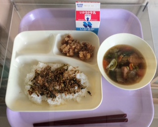 おかずは、鶏肉のたつたあげ、厚あげと野菜の煮物、おかかなっ葉です。