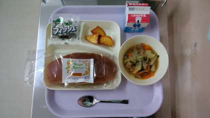 今日は、豚肉といかの中華煮、大学いも、ミニフィツシユ、黒糖コッペパン、アプリコットジャム、牛乳です。