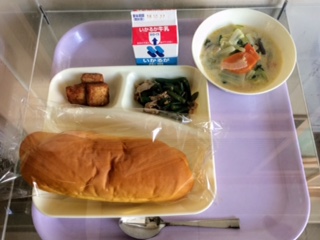 白菜のクリーム煮、厚あげのごまじょうゆがけ、豚肉と三度豆のオイスターいため、パンプキンパンと牛乳です。