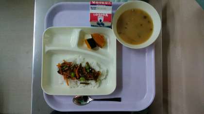 今日は、もずくと豚ひき肉のジューシー、みそ汁、焼きかぼちゃの甘みつかけ、米飯、牛乳です。