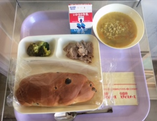 豚肉のガーリック焼き、マカロニと野菜のスープ、ブロッコリーのサラダ、スライスチーズ、レーズンパン(大)と牛乳です。