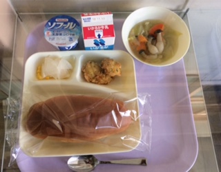 白身魚のフリッター、スープ煮、大根のピクルス、黒糖パン(大)とヨーグルト、牛乳です。