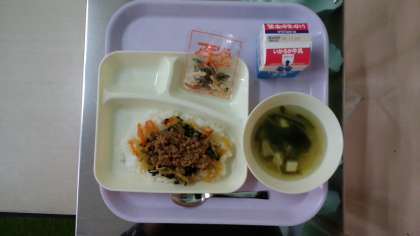 メニューは、ビビンバ、わかめスープ、アーモンドフィッシュ、牛乳です。