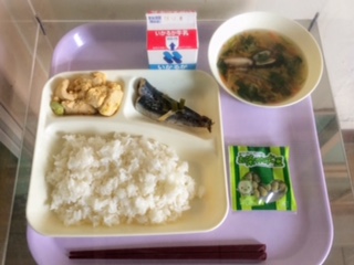 おかずは、いわしのしょうが煮、高野豆腐の卵とじ、まっちゃ大豆です。
