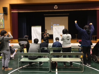 平野支援学校の生徒とチームをつくり、友だち探しクロスワードやボッチャを楽しみました。