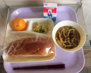 カレーうどん、はくさいのおひたし、みかん、おさつぱんです。
