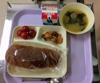 さけのマリネ、肉団子と麦のスープ、プチトマト、ライ麦パン(大)です。