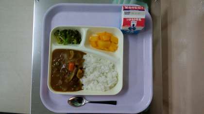 今日は、冬野菜のカレーライス、ブロッコリーのサラダ、黄桃、牛乳です。