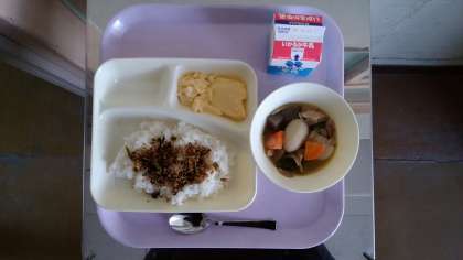 今日は米飯、たまごどうふ、豚肉とさといもの煮物、 おかかなっ葉、牛乳です。