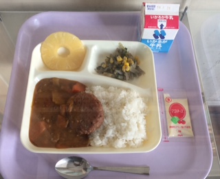 豚肉と金時豆のカレーライス、焼きハンバーグ、ごぼうサラダ、パインアップル(缶)に牛乳です。