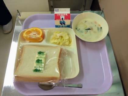 ほうれん草のクリームシチュー、キャベツのサラダ、いよかん、食パン2枚とマーガリンでした。