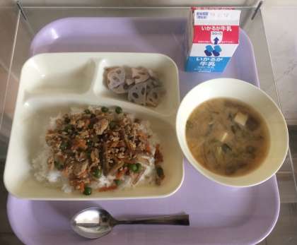 鳥ごぼうごはん、ずいきのみそ汁、焼きれんこんです、