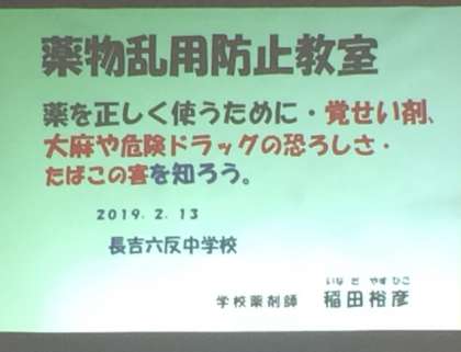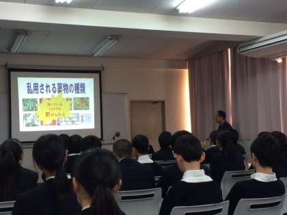 後半は覚醒剤や大麻などの薬物乱用の危険性についてでした。つい好奇心から手を出してしまい、依存症や中毒になってしまう。タバコも同じですね。みんな、真剣に聞いてくれていましたが、絶対に手を出さないでください。