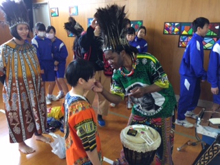 休み時間には希望者にフェイスペイント。民族色豊かなシャツや帽子もかぶって雰囲気を高めます。