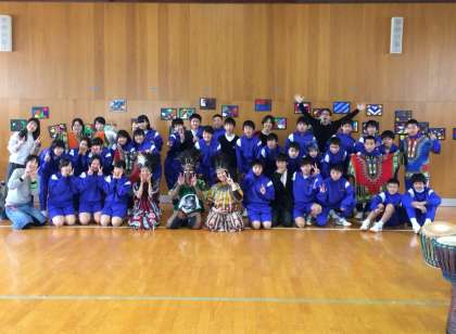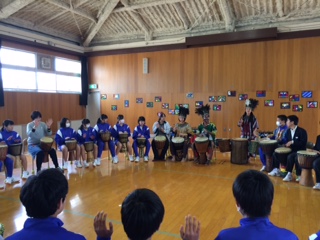 仕上げは、先生も含めて全員が輪になって太鼓を打ち鳴らしてリズムセッション。体が自然に動き始めます。楽譜がなくリズムの掛け合いで自由に演奏するアフリカの音楽を楽しみました。