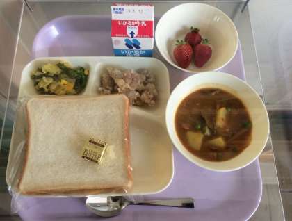 パン献立で、フライドチキン、カレーシチュー、春のカラフルソテー、いちごの組み合わせです。