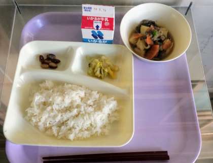 おかずは、肉じゃが、はくさいのゆず風味、とら豆の煮物と和風の献立です。