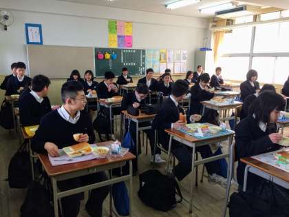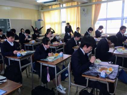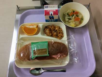 献立は、豆腐のミートグラタン、押し麦と野菜のスープ煮、デコポン、コッペパン(大)とりんごジャムでした。