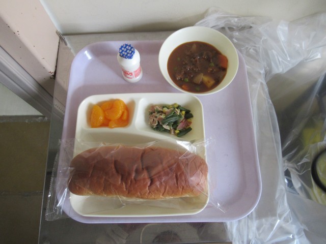 今日の給食の献立は、黒糖パン、牛乳、ビーフシチュー、ベーコンと三度豆のソテー、みかん(缶)、発酵乳でした。