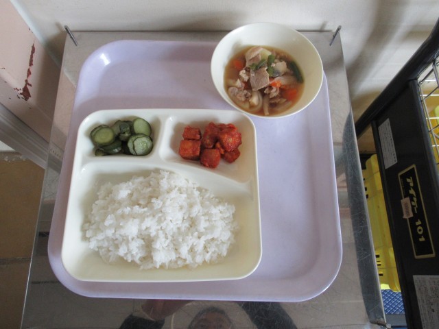 今日の給食の献立は、ごはん、牛乳、まぐろのオーロラ煮、豚肉と野菜の煮物、キュウリのゆず風味でした。
