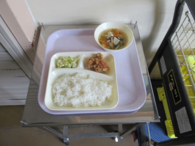 今日の給食の献立は、ごはん、牛乳、鶏肉のたったあげ、五目汁、キャベツの梅風味でした。