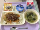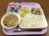 今日は米飯給食です。 おかずは、鶏肉の甘辛焼き、みそ汁、キャベツの梅風味。 牛乳...