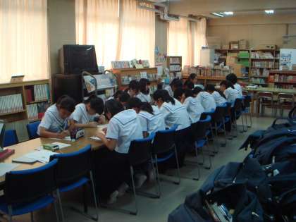 いつも、希望者のみで楽しく勉強していますが、今日は、プリントが足りなくなるほど、多くの生徒が集まりました。図書館ボランティアの方が、本の修理をしていただいている横でも、熱心に英単語探しに取り組みました。そのあと、映画「風立ちぬ」の一部を見た後、ジェイソン先生と英語で会話をしました。
