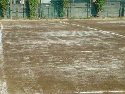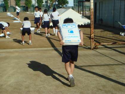9月8日(月) 放課後、運動会に備えて、「にがり」まきをしました。「にがり」をまくことにより、空気中の水分を吸収し、砂ぼこりを防止できるようになります。運動会の練習中や運動会当日の際も、競技や演技、観覧に集中できます。左の写真は、準備中のものです。きめられた枠内にまず、一袋ずつ置いていきます。真ん中の写真は、背中に載せて、運んでいる生徒です。右の写真は、まいた後の写真です。運動場が白くなりました。2年生の常置委員を中心に運動部の生徒も手伝って、教職員とともに一生懸命作業してくれました。