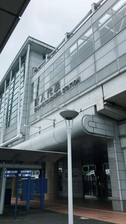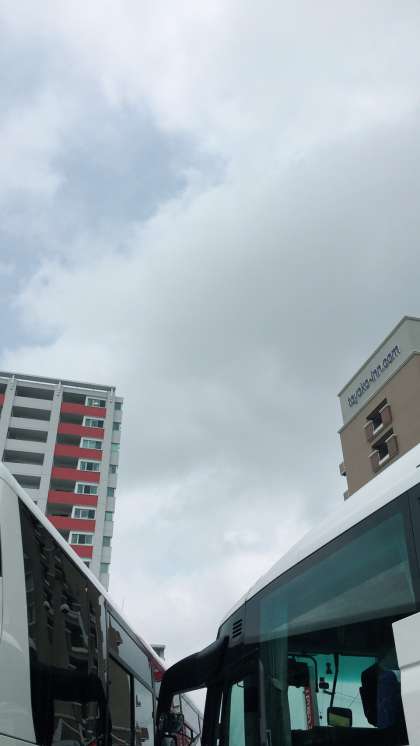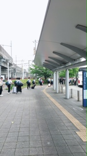 新八代駅に着いて、バスの方へ移動しています。天候は、曇りで蒸し暑いです。