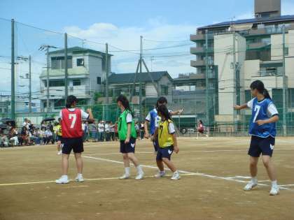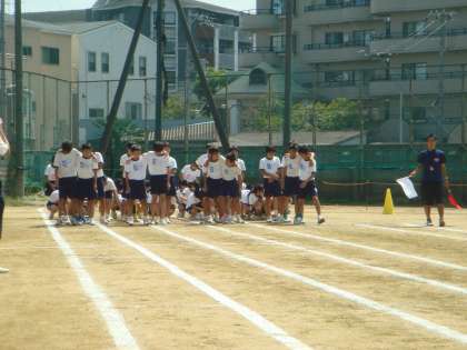 二人三脚のスタートの様子です。下は、三年全員リレーの様子です。
