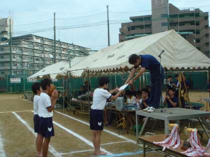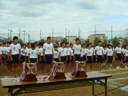 閉会式の様子です。新記録の表彰、入場行進の表彰のあと、各学年優勝・準優勝の表彰がありました。