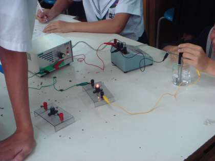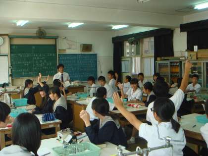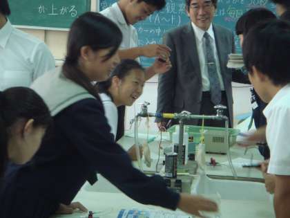 10/9(木) 2年目教員の研究授業がありました。3年生の理科の授業です。さまざまな水溶液に電流が流れるかを調べる実験でした。校長先生をはじめ、本校の先生方が数名、教育センターより、教育指導員の先生、瓜破西小学校の先生が2名来られていました。先生の質問に元気よく、手をあげる姿が見られました。豆電球が点灯することで、電流が流れるのを確認していました。最後の白い粉末を水に溶かして、電流を流し続けると、液が着色し、生徒たちも見ている先生方もさらに学習したくなる内容でした。