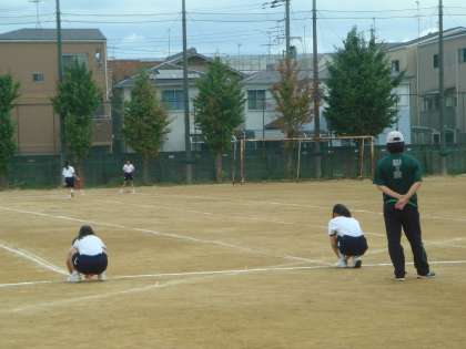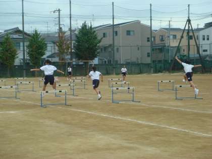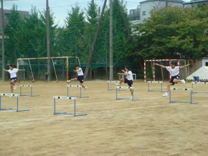 10/9(木) 2年目教員の研究授業がありました。3限の1年生女子の保健体育の授業です。陸上競技の「ハードル走」を学習しました。校長先生をはじめ本校の先生方数名、教育センターの教育指導員の先生、瓜破西小学校の先生1名が授業を参観しました。運動場に、メジャーをおき、ハードルを置くことから授業が始まりました。先生がどのように走るか演示されました。なかなか3歩でインターバルをリズミカルに走ることが難しく、あちこちでハードルをひっかけている場面が見られました。ハードルとハードルとの間がすこし広い列に、積極的に挑戦している生徒もいました。