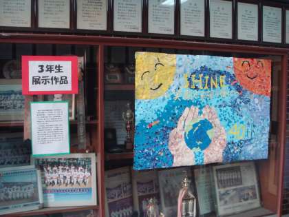 写真は体育館入口の作品・体育館前エレベーターホールの作品・3年玄関ホールの作品です。