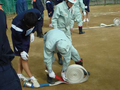 3年生は、可搬式ポンプを使った訓練を行いました。具体的には、ホース延伸・収納訓練、エンジン始動訓練、放水訓練に分かれて行いました。一部、時間の都合で、残念ながら、すべての訓練が終えられない班もありました。たくさんの大人の防災リーダーが、何度も訓練を受けて、本日の訓練のために来校していただきました。中学校卒業前に、このような訓練を受けることは、非常に意味のあることだと考えられます。次にこの地域で活躍してもらわなければならないのは、若い人たちです。大人の防災リーダーが、疲れ切ってくたくたになりそうな災害の際でも、若い人たちが活躍してくれると、助かります。東北の地震でも、中学生の活躍がありましたね。災害の際には、消防署や区役所の人たちは、すべての地域を守りきれません。