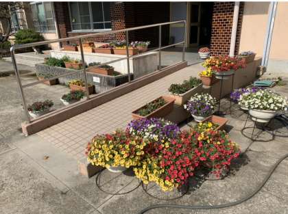 (管理作業員さんが中心となって、花の手入れや水やりをしていただいています。明日からの登校日にぜひ見てくださいね♪)