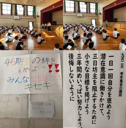 今日は3年生の学年集会がありました。集会では学年の先生からのお話や、委員長からの話がありました。修学旅行や進路、卒業式が近づく中で、学年全体で良いムードを作ってほしいと思います。委員長からは卒業まで学年・学級で毎日目標を作って達成していけるように呼びかけています。また集会で先生が話された内容も掲示していただきました。少しでも自分のことに置き換え、成長につなげていってほしいと願っています。