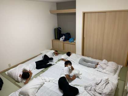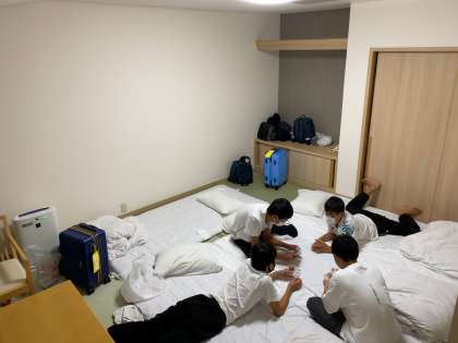 夕食の後は温泉に入りました。雲仙温泉は白色の濃度が高い温泉です。その後は各部屋でそれぞれの時間を過ごしています。この後2年生の時に見れなかった1年間の思い出ビデオを鑑賞します。