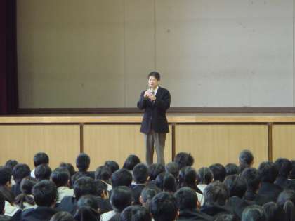「新しい年になりました。2011年には、なでしこジャパンの優勝があったが、今年は、オリンピックもなく、大きなスポーツイベントはない。経済面でよい年になるかもしれない。世界的に大きな問題がいろいろある。エボラ出血熱の問題、ユーロをやめようという動き、ロシアの通貨下落、日本の円安、アメリカの人種問題など。いろいろな学校の中には、授業中、廊下を徘徊する生徒のいる学校もある。廊下を徘徊する生徒はいないが、本校でも、全く問題がないわけではない。授業に出席していても、集中して学習しているとは思えない生徒も中にはいる。よそ見をしたり、寝てたらあかん。家庭学習に集中していますか。先生の話を一言も聞き漏らさない気持ちで取り組んでほしい。ひとりひとりの努力しかない。今年1年頑張ってほしい。」