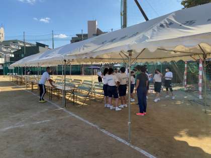 テントや椅子、入退場門の設置や石拾い、トイレ清掃など頑張ってくれていました。例年に比べて種目や内容が少なくなっていますが、無事に開催できることが本当に喜ばしいことです。限られた時間の中ですが、中身を濃くなるよう、全力投球してください。