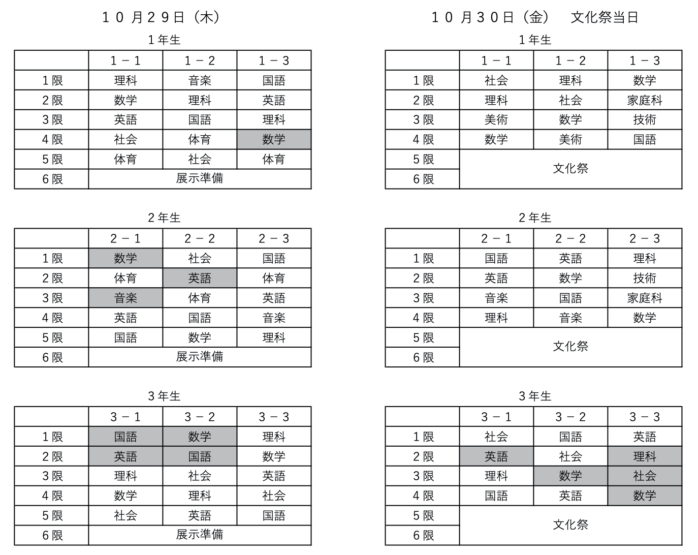 10月29日、30日の特別時間割