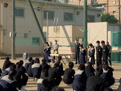 その後、前期生徒会執行部の3年生4名のあいさつ、認証された1、2年生6名のあいさつがありました。3年生4名も毎日のあいさつ運動や多くの取組に対して、本当に積極的に頑張ってくれていました。ぜひ後期のメンバーもその想いを引き継いでください。そしてそれ以外のみんなも生徒会活動に協力してあげてください。
