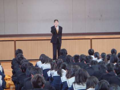 「今日は、環境の話をします。今のままなら、2,30年後、地球が2個必要などと言われている。人類が消費している食物や資源について、すぐやってくる2030年には、半分の人がふつうに生活するのに困る。アメリカ並みに消費したら、地球は、5,6個必要、日本並みでも、地球があと2,3個必要と言われる。日本では、「安全と水は、ただ。」とよく言われる。水も限りある資源である。地球上の水は、そのほとんどの97%が海水である。あと、3%は、淡水だが、そのほとんどが南極・北極と地下にある水だ。中央アジアのアラル海は、琵琶湖の100倍ほどの大きさで、世界地図にも掲載される湖だった。2つの川がこの湖に水が流れ込むが、無計画に水を使ったため、ついに、水がなくなってしまった。塩分を含む湖だったため、まわりに塩分が散らばり、農業どころではなくなってしまった。朝シャンや水道の出しっぱなし、毎日、風呂に入ることを含めて、水の無駄遣いはないだろうか。環境を守るという視点で、毎日過ごして下さい。」