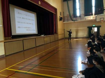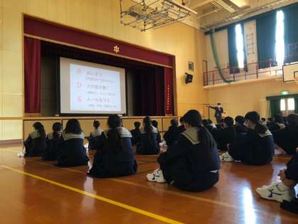 学年の先生たちの自己紹介の後、中学校生活を送っていく上で、守ってほしいこと、してはいけないことなどの確認をしました。